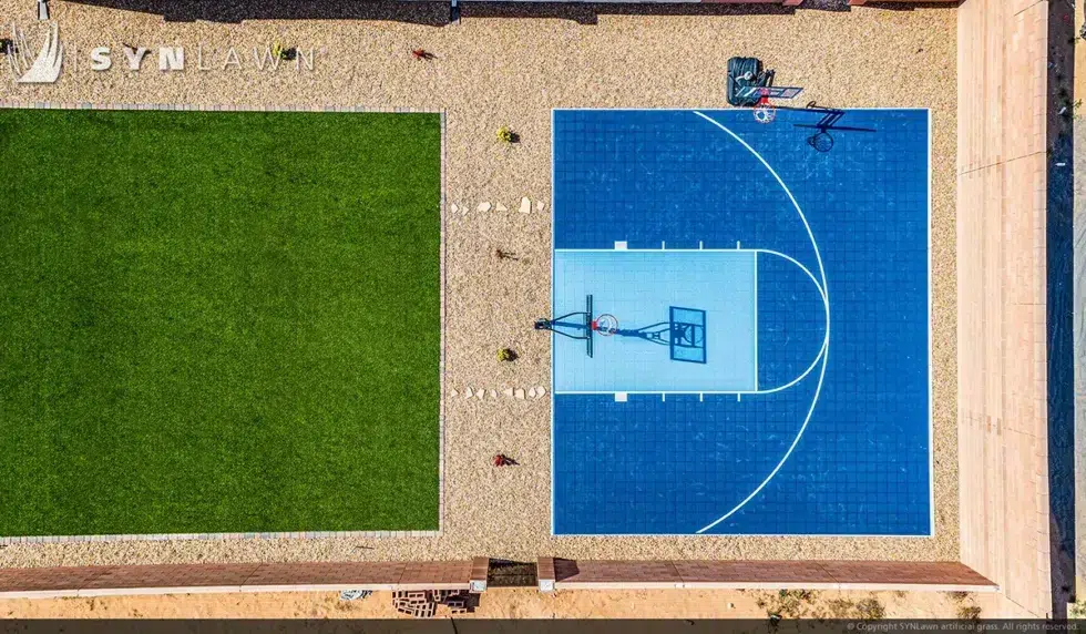 The timing was vital since they wanted a private getaway spot due to COVID-19 restrictions that required them to stay home. SYNLawn New Mexico installed 3,315-square-feet of SYNPro 70 and 1,152-square-feet of blue SYNCourt™ to revitalize the yard space with much-needed color. SYNPro 70, a USDA Certified Biobased Product, was used for the majority of the backyard space to provide a realistic grass look. SYNCourt was also selected to create a beautiful custom 2-tone blue half-court basketball court. This product’s dynamic and colorful appearance, combined with its inherent safety, maintenance, and performance characteristics, make it the ideal choice for sports surfacing.