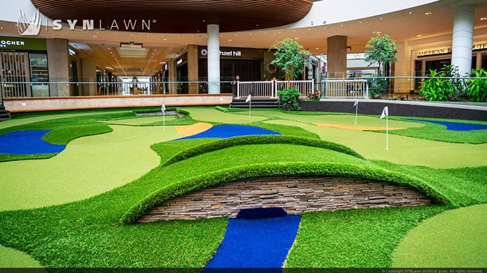 Erin Mills Mall: John Larsen and the team from SYNLawn Toronto installed a professional-quality, 9-hole mini-putt golf course called “The Green Mini Golf,” at the Erin Mills Mall in Mississauga, Ontario, Canada. The approximately 5,000 square feet course was designed to provide a more aesthetically pleasing environment and offer a variety of golf experiences. The team leveraged their vast experience installing one of a kind putting greens to plan and design “The Green Mini Golf.” The unique circular indoor space created an exciting challenge to build a rolling and smooth mini golf course made with synthetic golf turf. The team used several turf styles for the project, including Precision Putt, SYNTipede 343, SYNRye 200 Tan, and SYNPlay 48 Blue that incorporated the undulation and mounds that Erin Mills Mall desired. They also made it modular so the course could be temporarily removed around the holiday season as requested by the client.