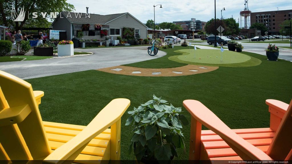 Gardeners, landscapers, and house plant lovers alike can also find gardening supplies and plants. The Miller’s realized their downtown showroom, which receives daily vehicle traffic of 10,000 to 20,000 cars, needed an overhaul to catch the eye of everyone passing by. They selected SYNLawn’s bio-based artificial turf for a unique community putting green installation that encourages patrons as well as passers by to stop and enjoy the corner of Rangeline Road at 4th St.